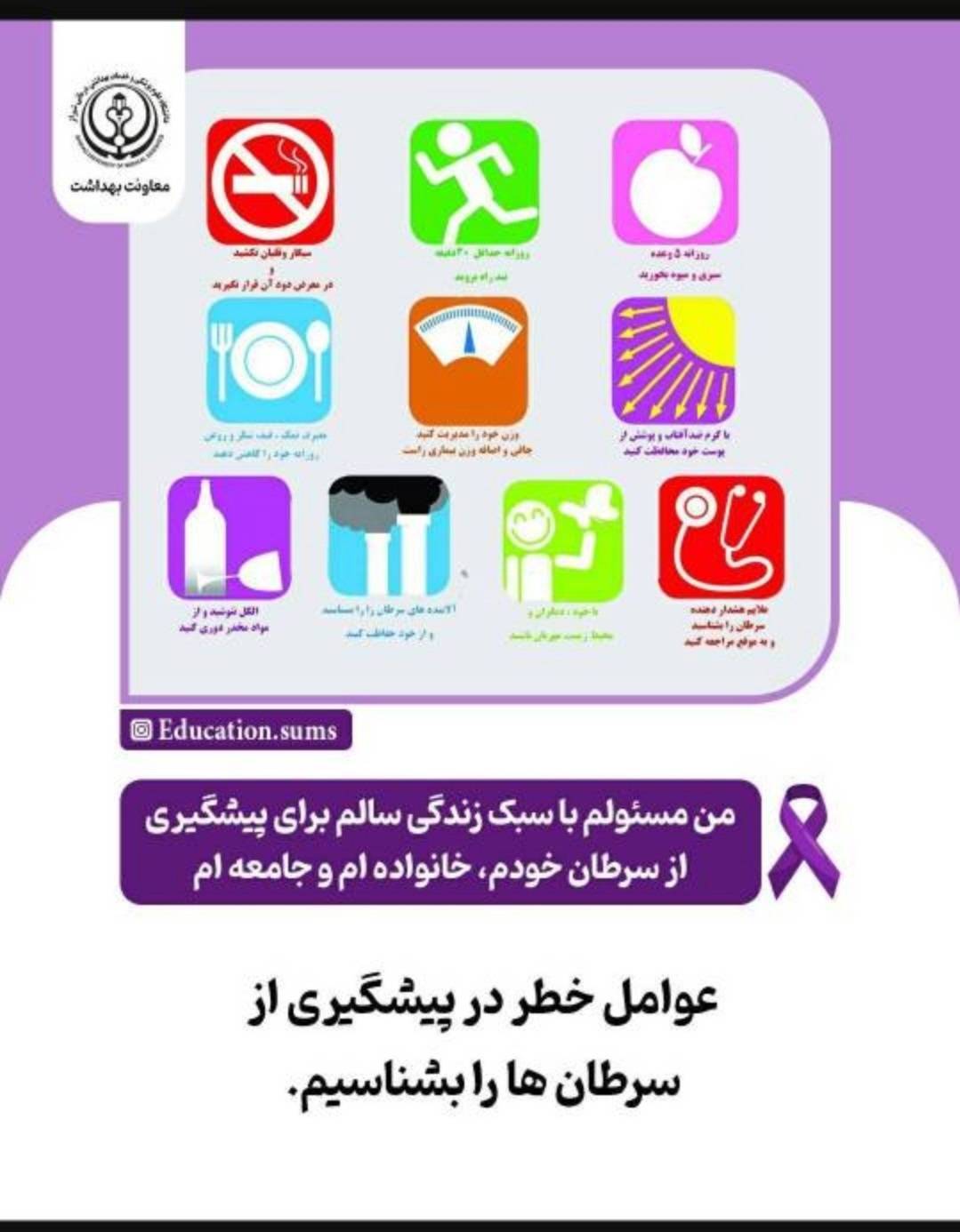 10. در صورت دارا بودن علاییم هشدار دهنده سرطان به پزشک مراجعه کنید؛ -ابتلای به سرطان در اقوام درجه یک-تغییر در خال های پوستی-زخم های بدون بهبود-توده در هر جای بدن-سرفه یا گرفتگی صدای طولانی مدت-اختلال بلع یا سوء هاضمه طولانی-استفراغ یا سرفه خونی-اسهال یا یبوست طولانی-خونریزی غیر طبیعی ادرار، مدفوع، واژن، نوک پستان-بی اشتهایی یا کاهش وزن بی دلیل